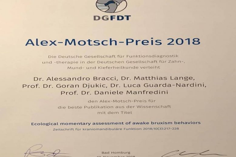 Premio Alex-Motsch-Preis 2018 per la pubblicazione: The ecological momentary assessment of awake bruxism behaviors Vedi tutte le pubblicazioni del dr. Guarda Nardini