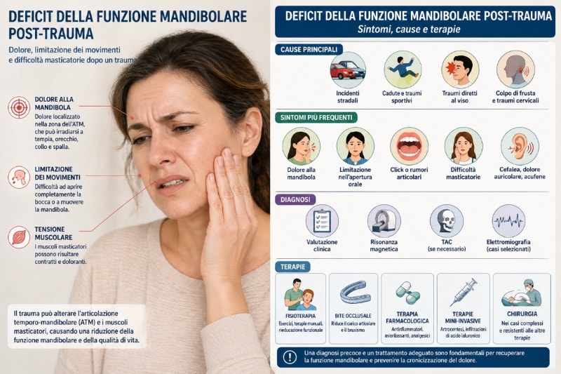- Il deficit della funzione mandibolare post-trauma è una condizione frequente dopo traumi facciali o cervicali.