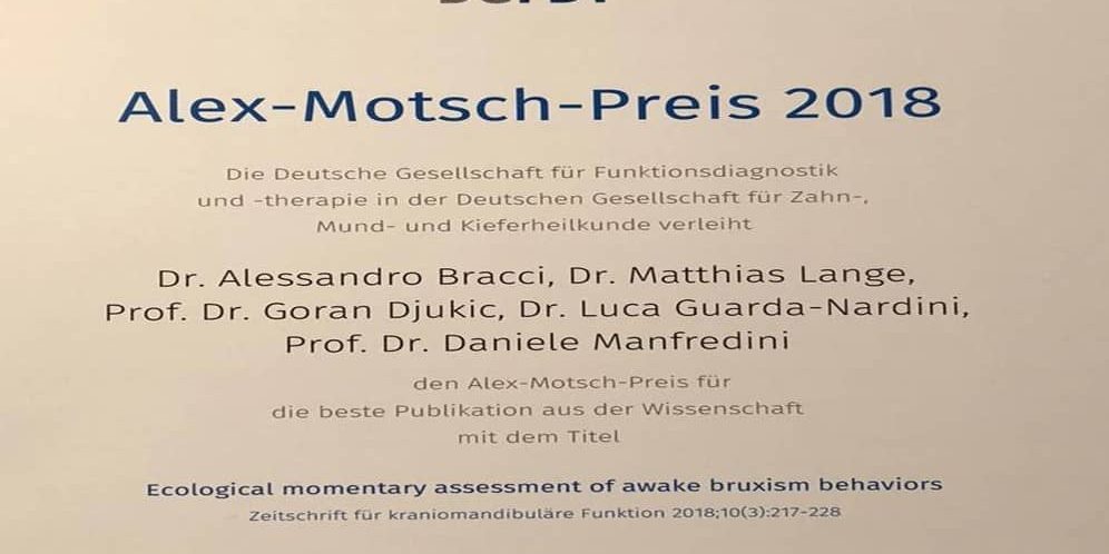 Premio Alex-Motsch-Preis 2018 per la pubblicazione: The ecological momentary assessment of awake bruxism behaviors